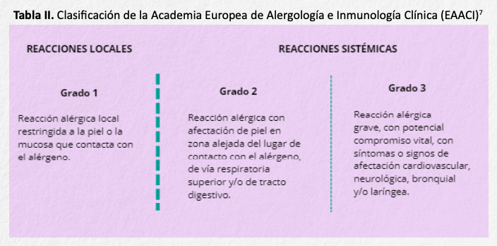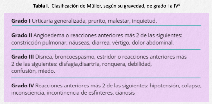 Las clasificaciones más utilizadas para valorar la gravedad de las reacciones sistémicas son las de Müller6 y las de la Academia Europea7 (tablas I y II).