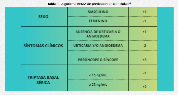 Para identificar a estos pacientes con alta probabilidad de presentar un síndrome de activación mastocitaria clonal (SAMc), se debe aplicar el algoritmo publicado por la Red Española de Mastocitosis (REMA). Una puntuación mayor a 2 indica alta probabilidad de SAMc, por lo que debe realizarse una biopsia de médula ósea o detección de mutación en sangre12,13 (tabla III).