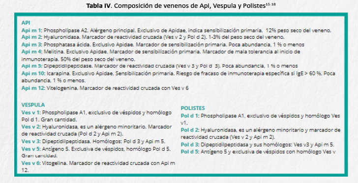 La composición del veneno de himénopteros es compleja y se resume en la tabla IV. Para alcanzar un buen rendimiento diagnóstico es imprescindible conocer el papel de cada componente del veneno en particular15-18.