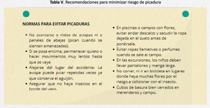 Se deberá proporcionar una información completa con el fin de reducir el riesgo de una nueva picadura y, en caso de que esta se produzca, saber cómo actuar de forma rápida. Para minimizar el riesgo de exposición existen unas normas que niños y padres deben conocer (tabla V).