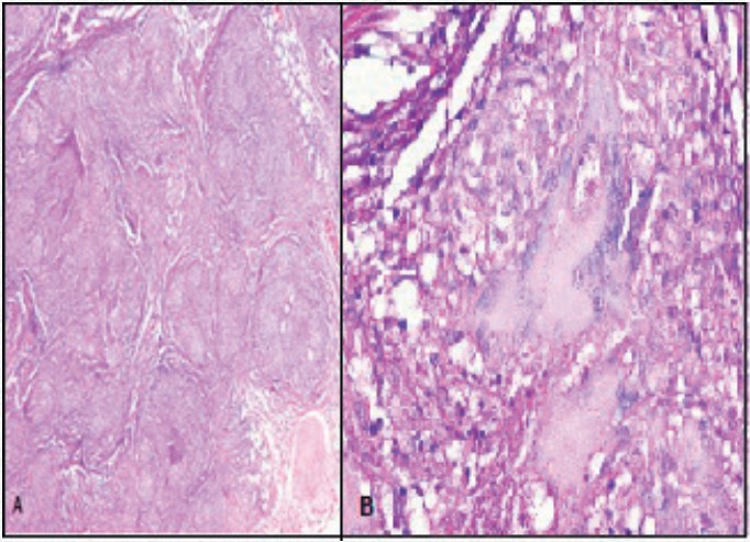 Figura 2. A: Tinción hematoxilina eosina (HE) 5X. Epiplón con numerosos granulomas con limites bien definidos. B: (HE 40X) Peritoneo: granulomas con células gigantes multinucleadas tipo Langhans con núcleos en disposición en herradura.