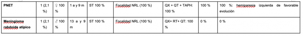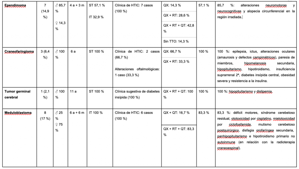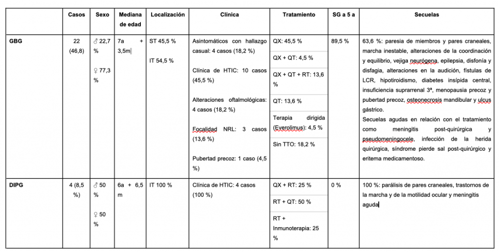 a: años; m: meses; DIPG: gliomas difusos de la protuberancia; GBG: gliomas de bajo grado; HTIC: hipertensión intracraneal; IT: infratentoriales; NRL: neurológica; PNET: tumores neuroectodérmicos primitivos; QX: cirugía; QT: quimioterapia; RT: radioterapia; SG: supervivencia global; ST: supratentoriales; TAPH: trasplante autólogo de progenitores hematopoyéticos;TTO: tratamiento.
